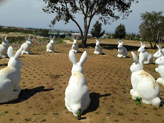 14隻高三呎左右的小白兔則在公園裡大樹下圍成一圈,相